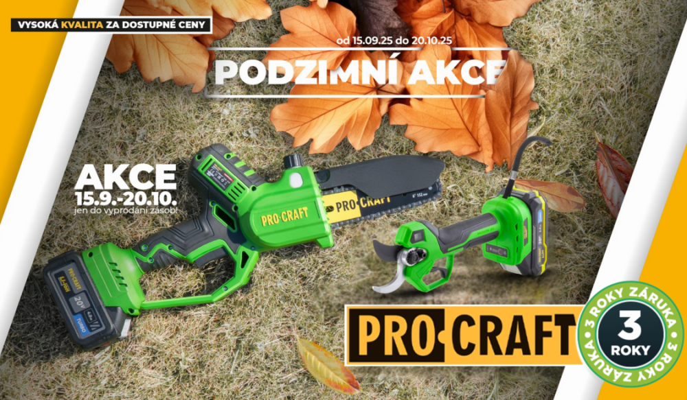 Využijte výhodné nabídky a nakupte si nářadí značky PROCRAFT v podzimní akci. Akční nabídka odstartovala 15.9. a končí 20.10.2025.